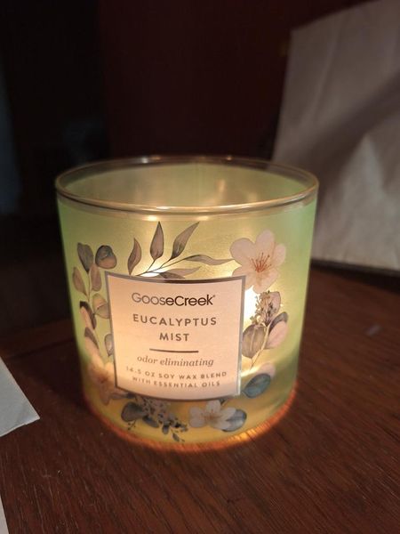 My family and I are so addicted to the Eucalyptus Mist 3-wick candle! I order extras just so I have them on hand in case it is ever discontinued. We feel this candle is magnificent. The aroma, its effectiveness on providing an amazing smell in the room and even tempering the fact that we have (2) cats! Awesome candle, Goose Creek!!!