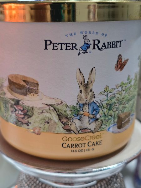 The containers for these deluxe 3-wick candles are always special. This one was perfect on my Easter dessert table. The scent truly was “carrot cake,” and all my guests appreciated the Peter Rabbit motif, especially the kids.
