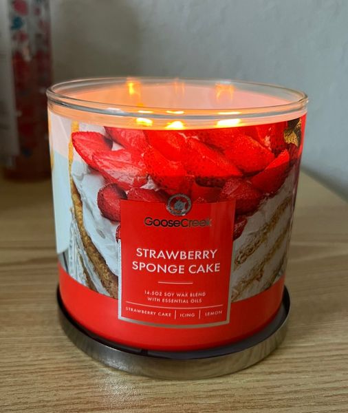 I had bought a candle from another store that was a strawberry shortcake scent and i loved it but when I went to buy a new one I was shocked that it was over $20 for a candle half the size of this Goose Creek one. I decided to try the Goose Creek Strawberry Sponge Cake candle and I was not disappointed! It smells just like a strawberry sponge cake. No chemical or perfumy smell. My mother didn’t like the smell of the candle in the box but raved about the smell while it was burning. I loved it both ways! I let it burn for about an hour and could still smell it hours after blowing it out! This is my first Goose Creek purchase but I will be a regular customer now. Love it!