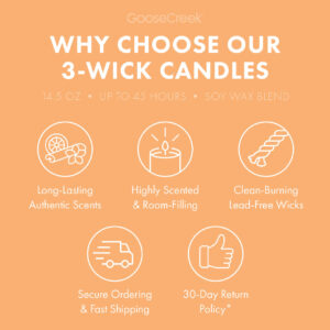 I am so glad I found Goose Creek. This 3 wick candle smells sunny, citrusy and fresh. It fills my room with this wonderful sent.